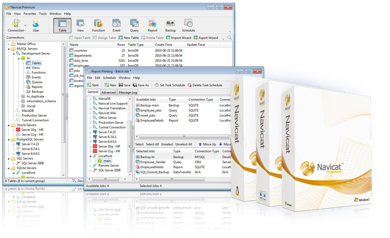Navicat Premium - это система управления базами данных, которая позволяет вам присоединяться к MySQL, SQL Server, SQLite, Oracle и PostgreeSQL базам данных одновременно, делая управление ими проще чем никогда ранее.