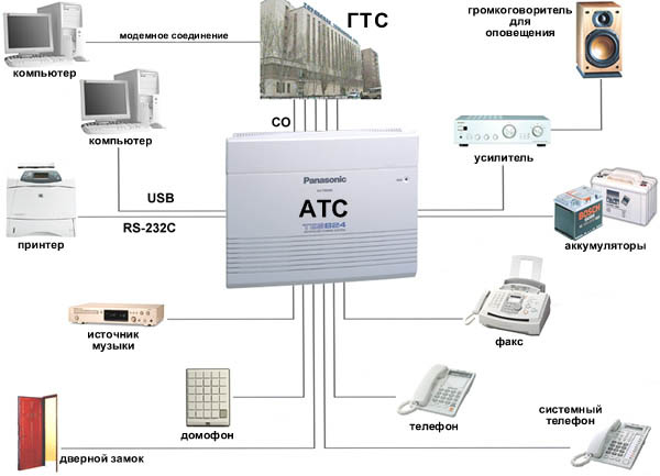 Мини АТС – автоматическая телефонная станция, учрежденческая АТС (УАТС) предназначена для использования внутри офиса компании. Как правило, количество абонентов мини АТС невелико и составляет от единиц до нескольких десятков. При этом телефонная сеть разделяется на внутреннюю и внешнюю. В зависимости от типа, может принимать не только аналоговые сигналы от провайдера телефонной связи и абонентов, но цифровые потоки, такие как IP-телефония. Иногда используется английская аббревиатура PBX (от Private branch exchange или Private business exchange).  Пример подключения мини АТС